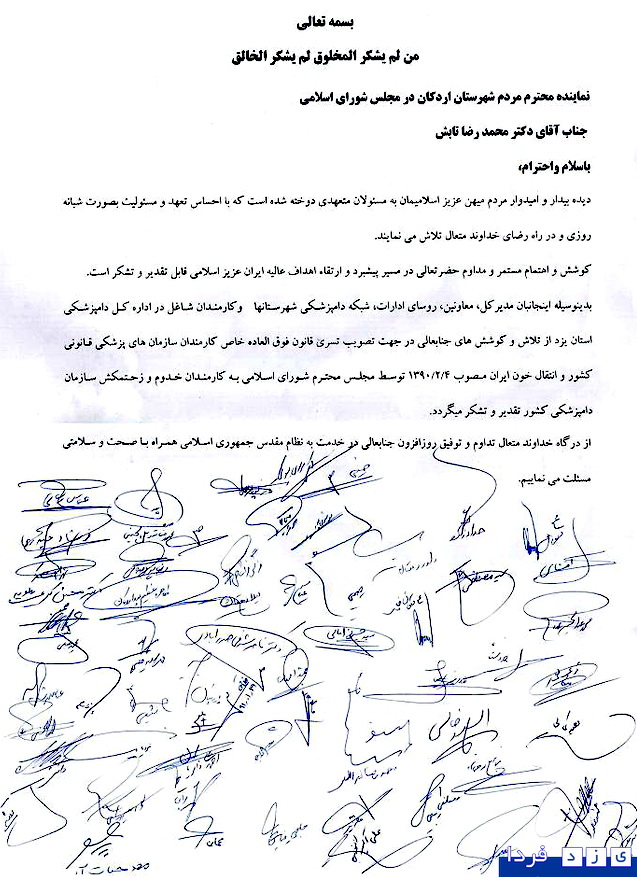 در این دیدار، نامه تقدیر وتشکر پرسنل دامپزشکی استان یزد از نماینده مردم اردکان، جهت تلاش در تصویب تسری قانون فوق العاده خاص کارمندان سازمان های دامپزشکی کشور و انتقال خون ایران، در مجلس شورای اسلامی به وی تقدیم شد.
