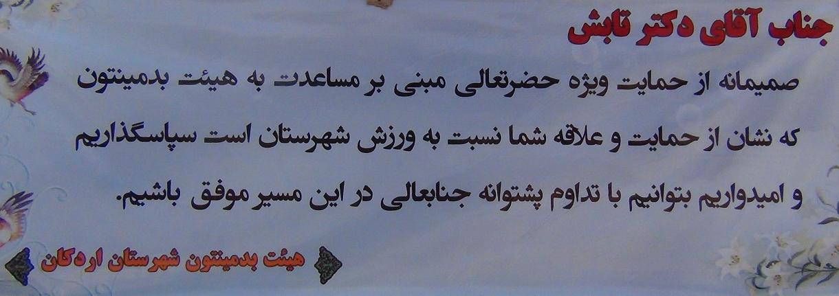 هیات بدمینتون اردکان در متن این تقدیرنامه آورده است:صمیمانه از حمایت ویژه حضرتعالی مبنی بر مساعدت به هیات بدمینتون که نشان از حمایت و علاقه شما نسبت به ورزش شهرستان است سپاسگزاریم و امیدواریم بتوانیم با تداوم پشتوانه جنابعالی در این مسیر موفق باشیم.