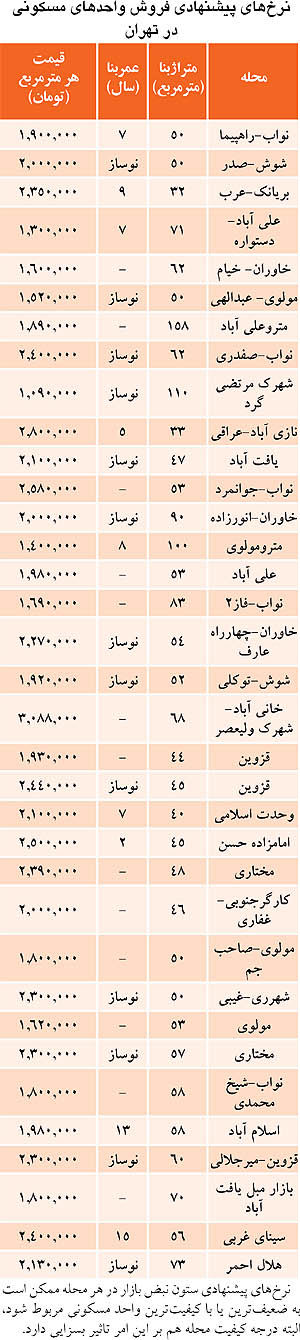 یکی از ارزان‌ترین واحدهای مسکونی که این هفته به بازار معرفی شد، مربوط به واحدی نوساز با متراژ ۱۱۰ مترمربع در شهرک مرتضی گرد در منطقه ۱۹ است.این واحد مسکونی به قیمت متری یک میلیون و ۹۰ هزار تومان به خریدار آماده تحویل است.اما از سوی دیگر بالاترین قیمت به واحدی ۶۸ متری در محله خانی آباد مربوط می‌شود. این واحد مسکونی واقع در شهرک شریعتی و از کلیه امکانات هم بهره‌مند است.
