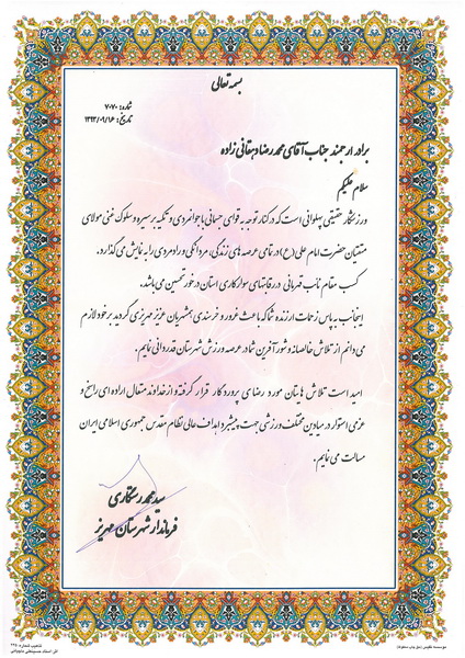 بله، امید دارم که با لطف خدا و حمایت مسئولان شهرستان، ورزش سوارکاری در شهرستان رونق خاصی پیدا کند و با توجه به این رونق و با همکاری سوارکاران مهریزی بتوانیم با حضور گسترده در مسابقات سوارکاری کشوری و کسب مقامهای متعدد، شهرستان مهریز را در این مورد خوش آوازه کنم.