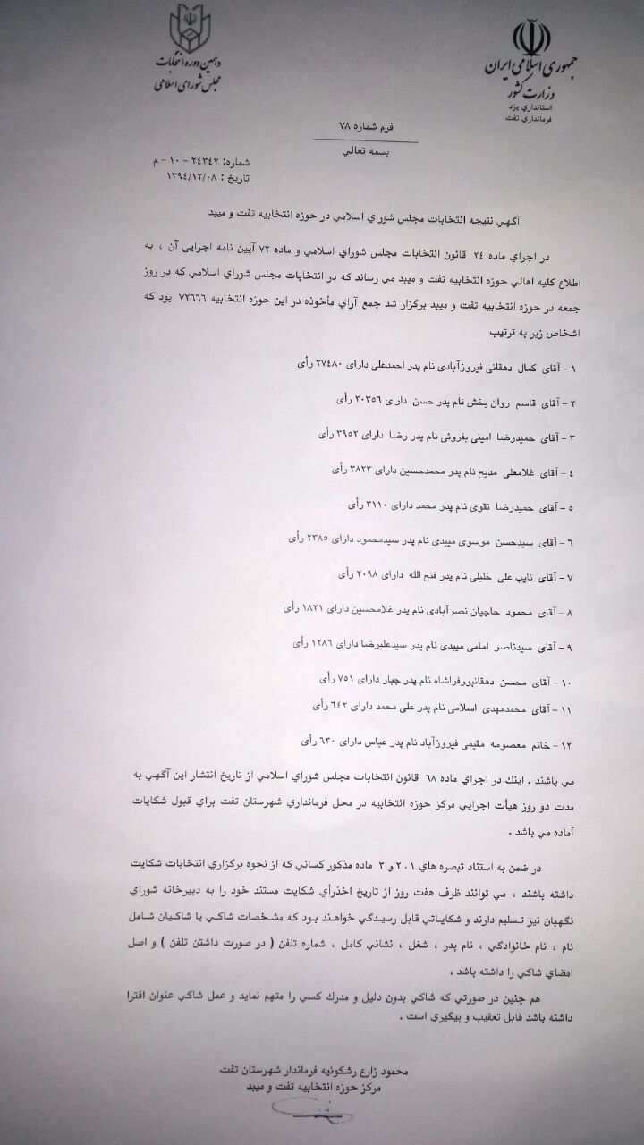 انتشار آگهی نتیجه نهایی انتخابات دهمین دوره مجلس شورای اسلامی در حوزه انتخابیه تفت و میبد