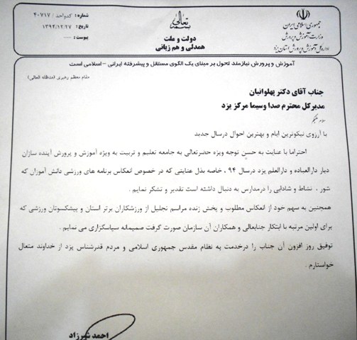 " احمد شيرزاد مدير كل آموزش و پرورش استان يزد با اهداء لوح سپاس از دكتر پهلوانيان مدير كل صدا و سيما ي مركز يزد به خاطر انعكاس مطلوب و پخش زنده مراسم تجليل از ورزشكاران برتر و پيشكسوتان ورزشي استان تشكر و قدرداني كرد .