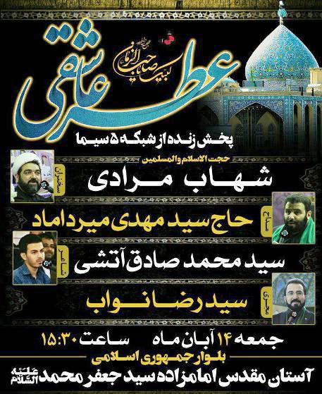 برنامه عطر عاشقی 14 آبان از ساعت 15:50 تا 17 از سیمای شبکه تابان و شبکه پنج سیما بطور همزمان و زنده پخش می شود.