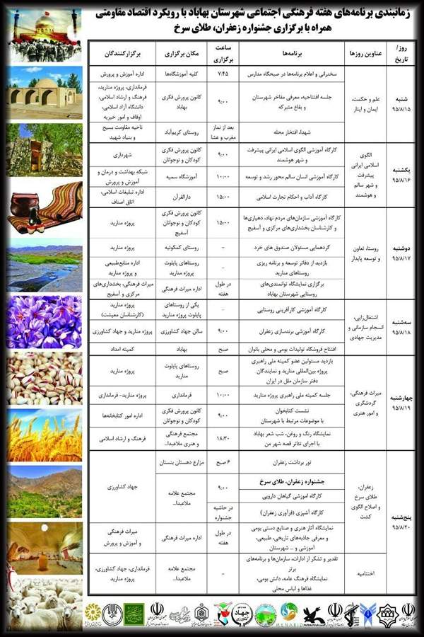 بازدید از مزارع زعفران و برداشت زعفران توسط مردم محلی، یک شب اقامت در شهرستان بهاباد، مسابقات عکاسی، نمایشگاه توانمندی های روستاییان در شهرستان، نمایشگاه گیاهان دارویی و زعفران بهاباد، بازدید از جاذبه های تاریخی، فرهنگی و طبیعی شهرستان از برنامه های اجرایی در طول هفته فرهنگی ـ اجتماعی شهرستان بهاباد می باشد.