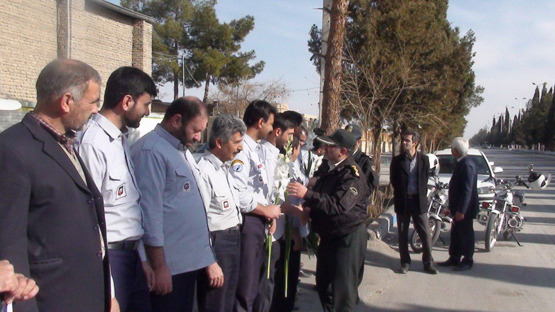 فرمانده منطقه انتظامی شهرستان مهریز بهمراه یزدانی رئیس راهنمای و رانندگی و جمعی از پرسنل منطقه انتظامی این شهرستان با حضور در مرکز اتش نشانی و خدمات ایمنی مهریز با ابراز همدردی با حادثه دیدگان حادثه تاسف بار سانحه آتش سوزی در ساختمان پلاسکوی تهران ، از آتش نشانان مهریز به نمایندگی از همه آتش نشانان فداکار در سراسر کشور دلجویی و تقدیر نمودند .