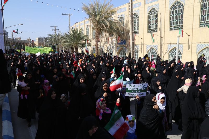 امروز مردم شهرستان بافق آمده اند که بگویند تا پای جان از انقلاب و رهبری حمایت خواهند کرد.