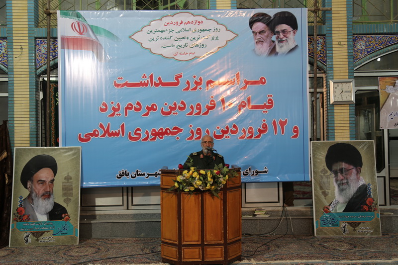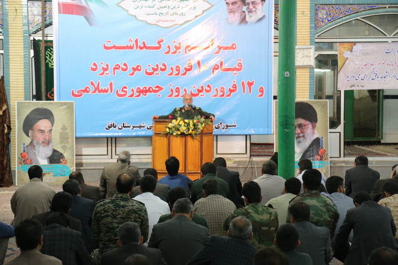 سردار اکبر فتوحی فرمانده سپاه الغدیر استان یزد سخنران این مراسم، به حوادث تاریخی این دو روز سر نوشت ساز در تاریخ کشور به ویژه رشادت ها و ایثارگریهای مردم دارالعباده یزد در قیام حماسی در 10 فروردین سال 1357 ، که یکی از نقاط آغازین و پیروزی انقلاب اسلامی بود، پرداخت.