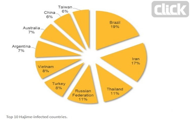برای نخستین بار بدافزار Hajime در ماه اکتبر شناسایی گردید. بدافزار فوق بعد از آلوده کردن ابزارهای تحت شبکه بعضی از پورتهای مشخص این دستگاهها را بسته و در نتیجه دسترسی بدافزارهای دیگر به این دستگاهها را غیرممکن میکند. تصویر زیر ده کشوری را نشان میدهد که نرخ آلودهسازی Hajime در آنها بالاتر بوده است.