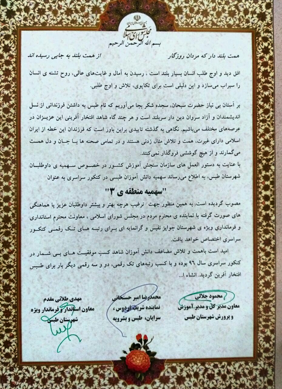 عده ای از هر فضایی برای تخریب دولت استفاده میکنند به عنوان مثال اعلام کردند در بخش کنکور طبس از منطقه ۳به ۲ تبدیل شده که این مسئله کذب محض بوده وشهرستان طبس کمافی السابق، منطقه ۳می باشد و دانش آموزان عزیز به ویژه کنکوری ها وخانواده های محترمشان نگران نباشند وبا آسودگی خاطر نسبت به تداوم مطالعه و تلاش اقدام نماید . انشاالله شاهد کسب رتبه های برتر دانش آموزان عزیز بیش از پیش در کنکور باشیم