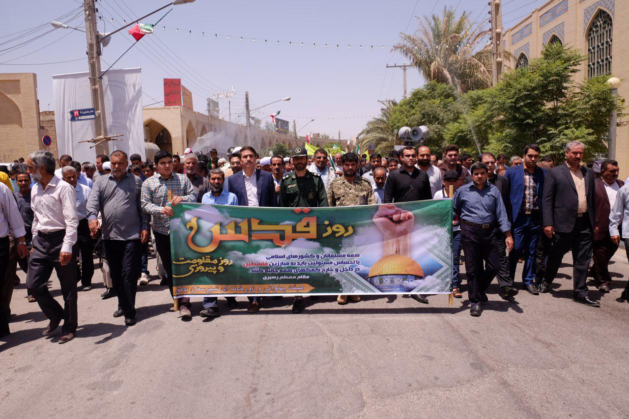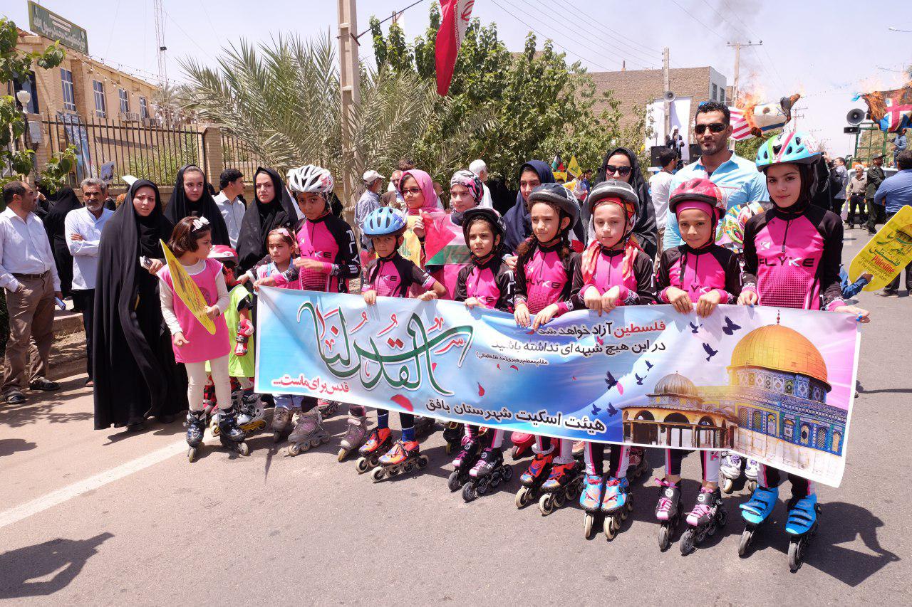 به گزارش روابط عمومی فرمانداری شهرستان بافق؛ همزمان با آخرین جمعه ماه مبارک رمضان و همگام با سایر نقاط میهن اسلامی و مسلمانان روز دار در سراسر جهان، راهپیمایی با شکوه روز جهانی قدس با حضور گسترده مردم مومن و وفادار به ارزش های اسلامی و آرمان های الهی بنیانگذار جمهوری اسلامی بافق از محل بسیج  به سمت مسجد جامع این شهر برگزار و فریادهای «مرگ بر آمریکا»،  «مرگ بر اسرائیل» و «مرگ بر آل سعود» در آسمان این شهرستان طنین انداز شد.