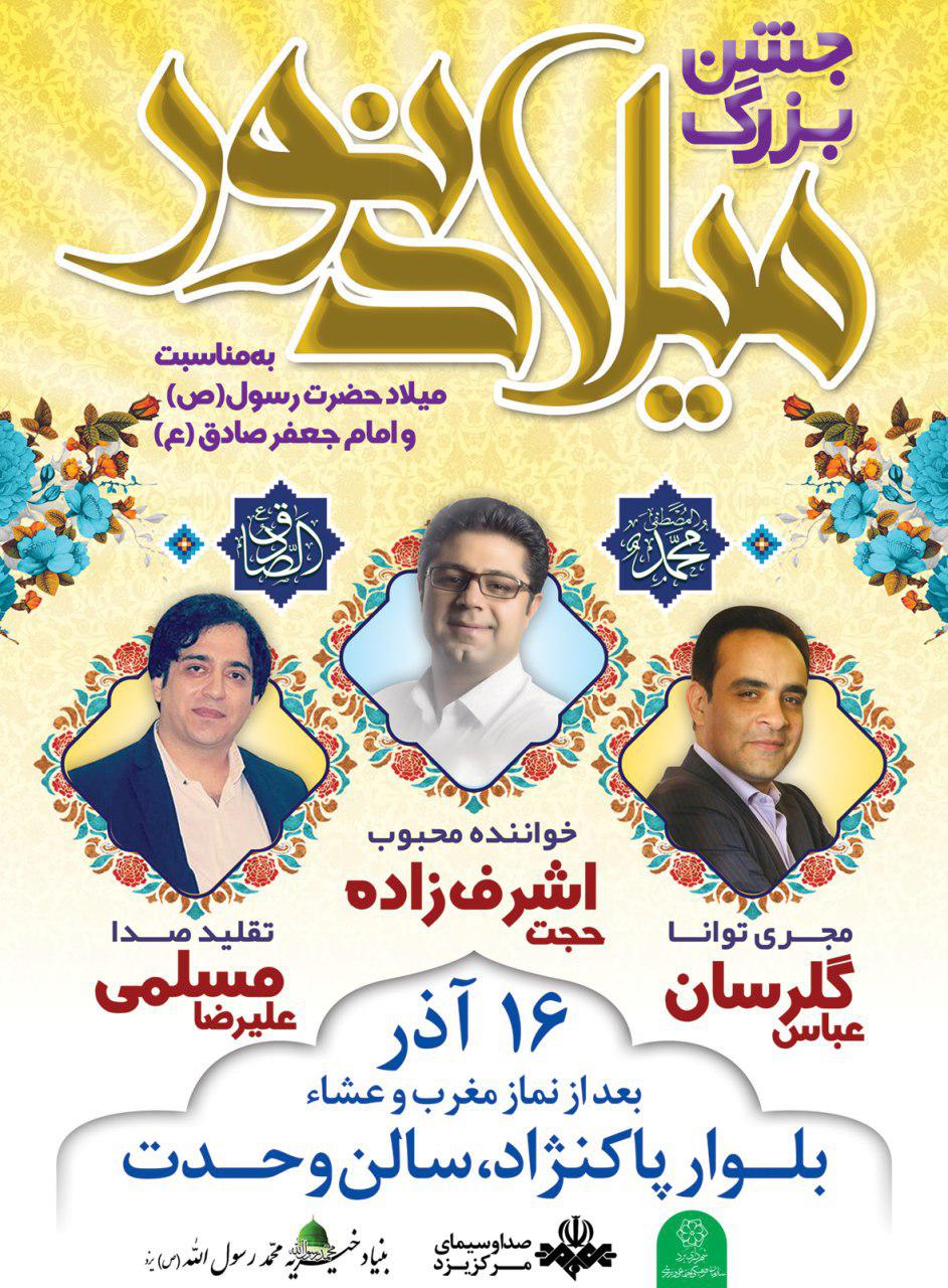 ه مناسبت میلاد با سعادت حضرت رسول (ص) و امام جعفر صادق(ع) جشن بزرگ میلاد نور در یزد برگزار می‌شود