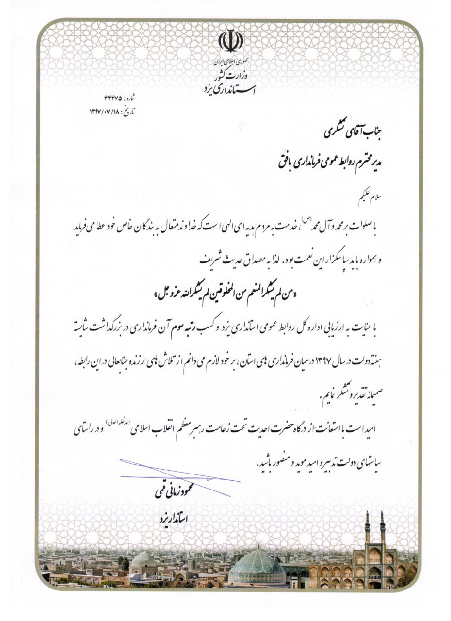به گزارش روابط عمومی فرمانداری شهرستان بافق؛ در ارزیابی اداره کل روابط عمومی استانداری یزد در زمینه گرامیداشت هفته دولت، روابط عمومی فرمانداری بافق رتبه سوم را در میان فرمانداری‌های استان یزد کسب کرد.