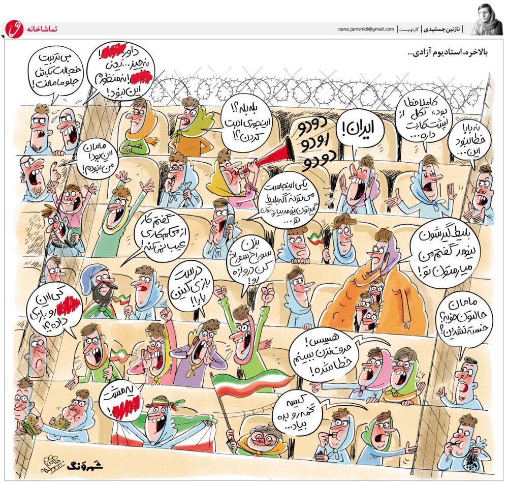 یزدفردا:صفحه طنز و کارتون شهرونگ با انتشار کارتونی از نازنین جمشیدی به حواشی اولین حضور رسمی بانوان در ورزشگاه آزادی برای دیدن دیدار تیم ملی ایران و کامبوج پرداخت.