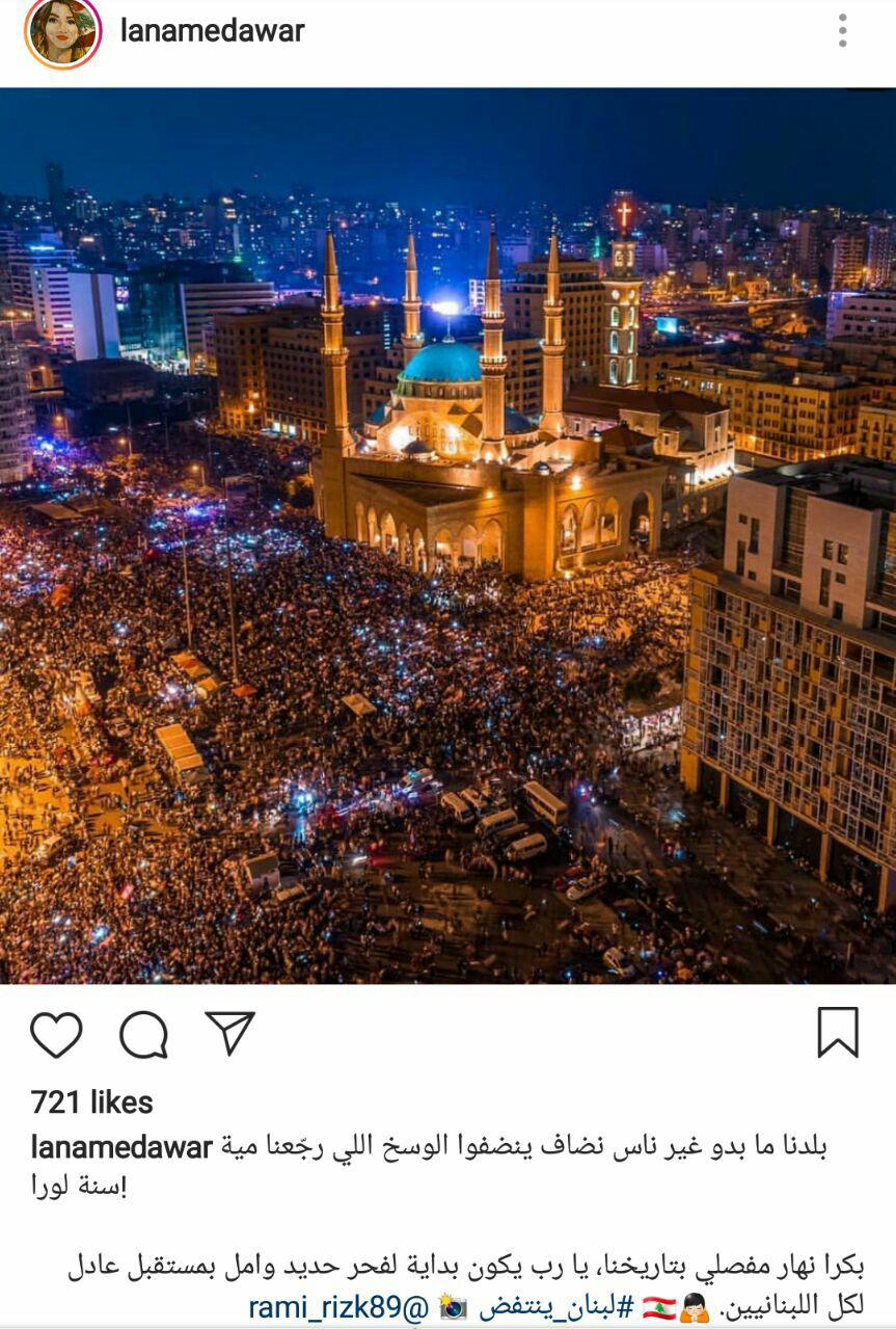 لانا مداوار(مجری مشهور المیادین) در صفحه توییتر خود به پوشش اخبار اعتراضات لبنان پرداخت. مداوار همچنین در اینستاگرام خود عکس زیر را منتشر کرد و همبستگی خود را با اعتراضات مردمی اعلام نمود.