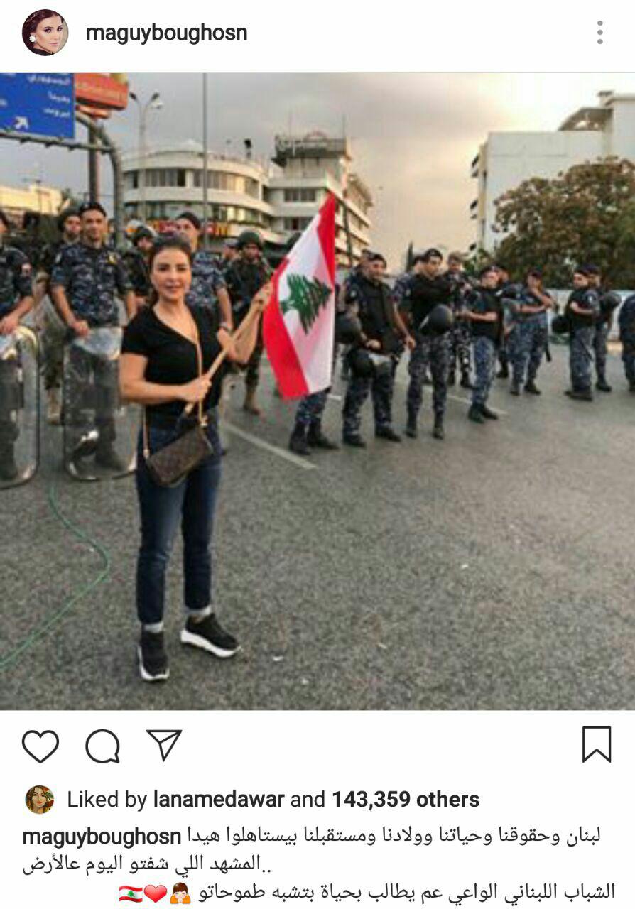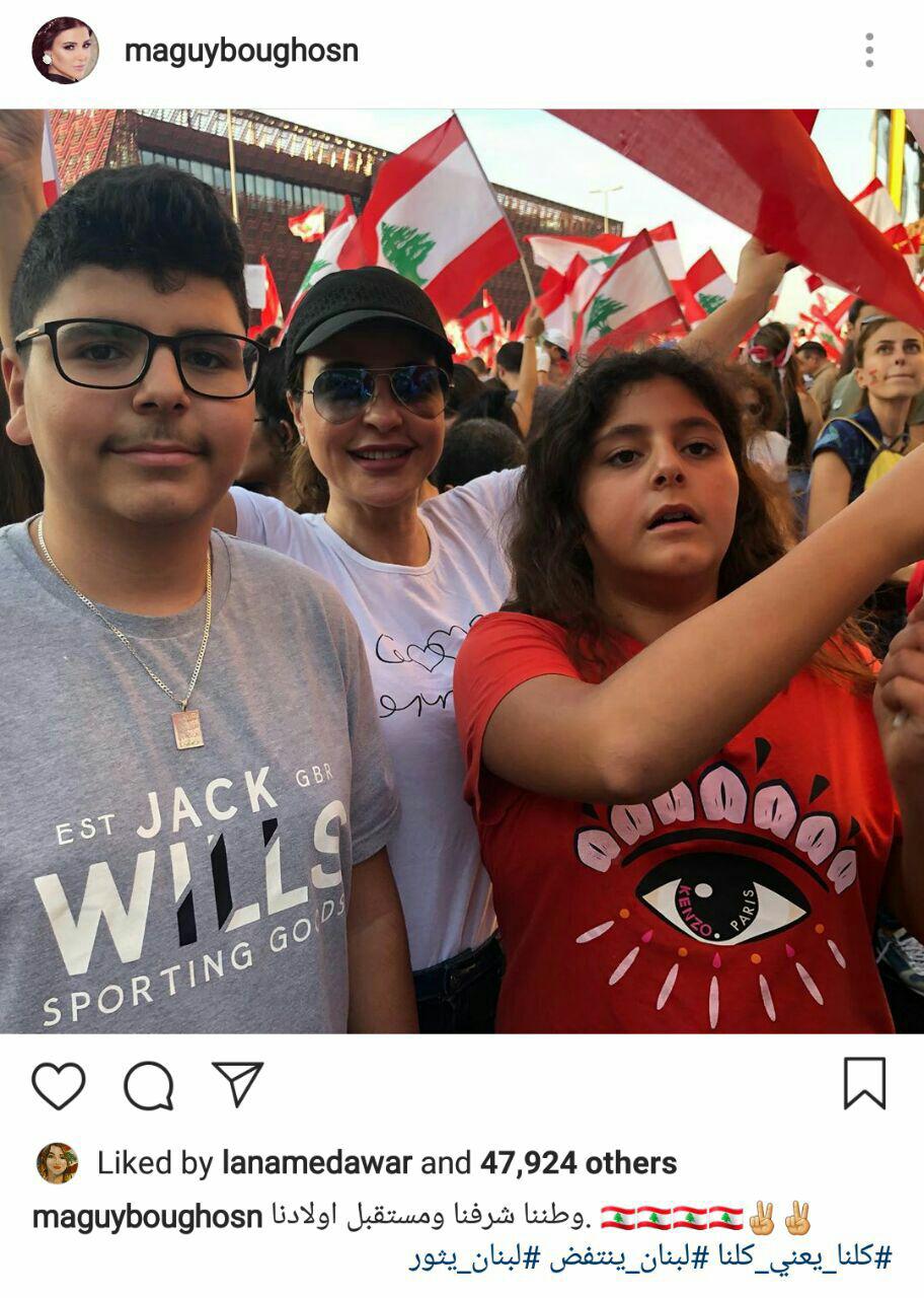 ماغی بوغصن (بازیگر مشهور و محبوب لبنانی) هم به همراه فرزندان خود در اعتراضات لبنان شرکت کرده و پستهای بسیاری را در اینستاگرامش در مورد تظاهرات اخیر منتشر کرد. بوغصن در پستی نوشت: "وطن ما افتخار و شرف ما و آینده فرزندان ما است".