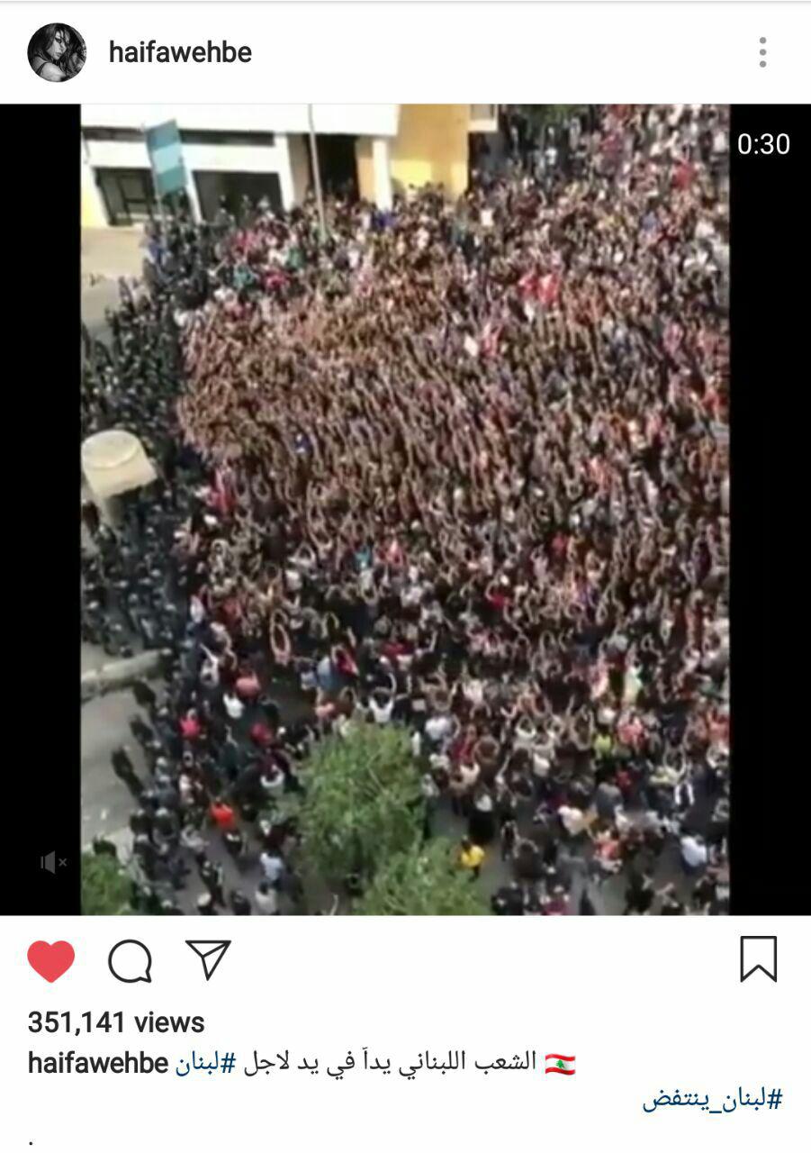 همچنین هیفا وهبی (خواننده مشهور لبنانی) در پستی حمایت خود را از اعتراضات لبنان اعلام کرد. هیفا در کپشن پست خود نوشت: "ملت لبنان، دست در دست هم برای لبنان".