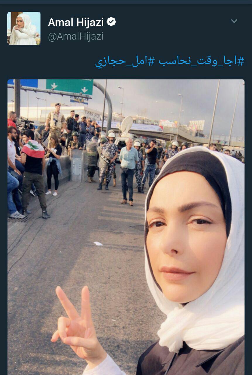 امل حجازی یکی دیگر از بازیگرانی بود که در تظاهرات اعتراضی بیروت شرکت کرد. حجازی، بازیگر و خواننده لبنانی است که اخیرا تمایلات مذهبی بسیاری پیدا کرده و به خصوص خبر محجبه شدنش بازتاب بسیاری داشته است.