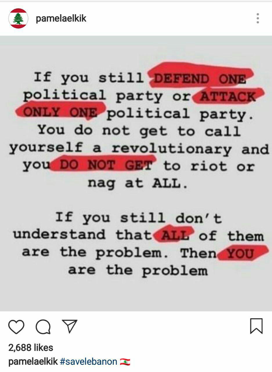 پاملا الکیک بازیگری است که به خاطر حضور در برخی سریالهای ایرانی در کشورمان هم شناخته شده است. الکیک عکس پروفایل خود را با پرچم لبنان تغییر داده و در چند پست مختلف به زبان عربی و انگلیسی حمایت خود را از تظاهرات لبنان اعلام کرده است. الکیک در یکی از پستهایش سعی کرد تظاهرات لبنانی‌ها را از حالت اعتراض به یک جبهه یا گروه یا حزب مشخص خارج کرده و به آن جنبه قیام ملی و انقلابی دهد.