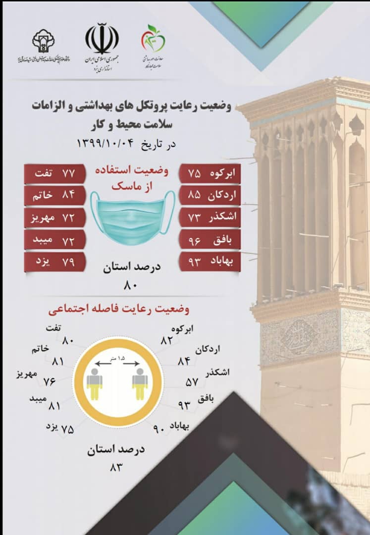 بار دیگر به همت مردم شهرستان بافق وضعیت رعایت پروتکل های بهداشتی و الزامات سلامت محیط و کار، باعث شد با ثبت رکورد 96 درصدی وضعیت رعایت مسائل بهداشتی شهرستان نسبت به سایر شهرستان های استان بار دیگر پیشتاز استان یزد باشد.