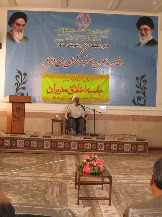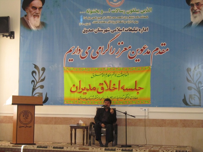 به گزارش روابط عمومي اداره تبلیغات اسلامی استان یزد ،چهارمين جلسه اخلاق ويژه مديران شهرستان صدوق با حضور فرماندار و مديران ادارات شهرستان وبا سخنراني حجت الاسلام فخرالديني رئيس شوراي هماهنگي تبليغات اسلامي استان يزد ، در محل مجتمع فرهنگي تبليغي اداره تبليغات اسلامي شهرستان صدوق برگزار شد .