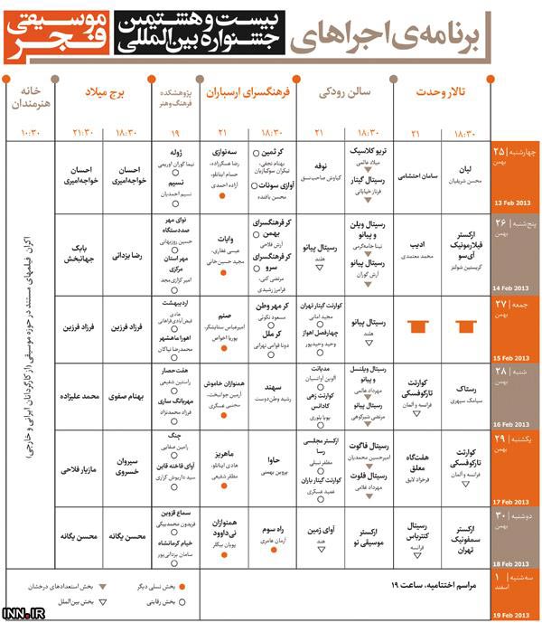 جشنواره موسیقی بیست و هشتم امسال در سالن های وحدت، رودکی و ارسباران در دو سانس ۱۸ و ۲۱ ، در برج میلاد در دو سانس ۱۸ و ۳۰/۲۱ ، در پژوهشکده فرهنگ و هنر در یک سانس ۱۹ و در خانه هنرمندان در سانس ۳۰/۱۰ برگزار خواهد شد.