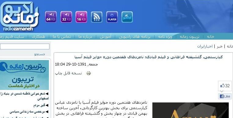 سایت رادیو زمانه نوشت: نامزدهای هفتمین دوره جوایز فیلم آسیا با نامزدی عباس کیارستمی برای بخش بهترین کارگردانی، آخرین ساخته بهمن قبادی در چهار بخش و گلشیفته فراهانی در بخش بهترین بازیگر زن معرفی شدند.