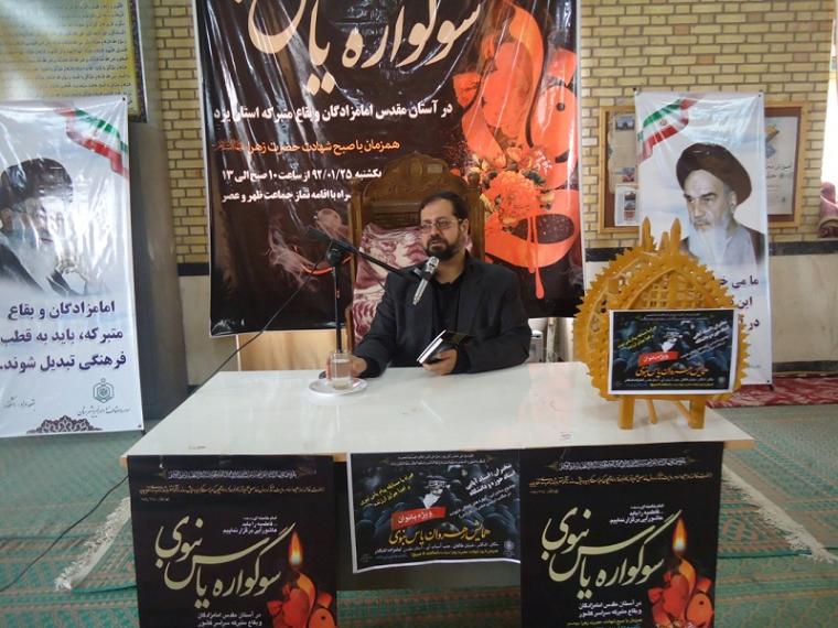 به گزارش روابط عمومی اداره کل اوقاف و امور خیریه استان یزد، در راستای برگزاری مراسم سوگواره یاس نبوی در امامزادگان و بقاع متبرکه اولین همایش رهروان یاس نبوی ویژه خواهران روز یکشنبه 25/01/92 همزمان با شهادت مظلومانه صدیقه کبری حضرت فاطمه زهرا(س) با حضور استاد آبایی مدرس حوزه و دانشگاه در محل امامزاده مراد اشکذر برگزار شد.