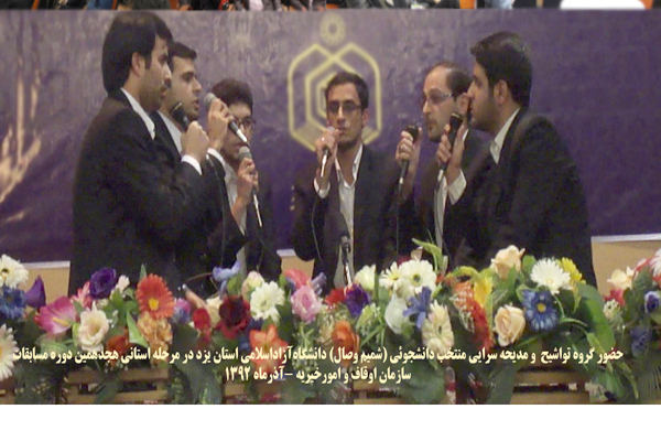 همچنین مرحله استانی هجدهمین دوره مسابقات سراسری مدیحه سرایی و همخوانی قرآن کریم و اذان ، ابتهال و همخوانی و تواشیح سال 92 ، در روز جمعه 22 آذر ماه سال جاری با حضور متسابقین راه یافته شهرستان به مرحله استان یزد در محل سالن اجتماعات سید الشهداء آستان مقدسه امامزاده جعفر یزد برگزار شد که در این میان گروه همخوانی و تواشیح منتخب دانشجویی (شمیم وصال )دانشگاه آزاد اسلامی یزد نیز در این مرحله به اجرای برنامه همخوانی قرآن کریم و تواشیح پرداخت .