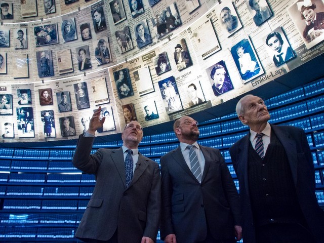 "مارتین شولز" رییس پارلمان اروپا (نفر وسطی) در حال بازدید از موزه هلوکاست در شهر قدس
