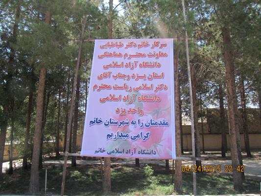 دكتر اسلامي، رئيس دانشگاه آزاد اسلامي واحد يزد به اتفاق خانم دكتر طباطبايي، معاون هماهنگي دانشگاه هاي آزاد اسلامي استان از مركز خاتم  بازديد كردند. در اين بازديد يك روزه كه زاده رحماني، فرماندار خاتم ايشان را همراهي مي كرد وضعيت فعلي دانشگاه آزاد اسلامي مركز خاتم مورد بازديد و در خصوص برنامه هاي آتي اين واحد دانشگاهي بحث و تبادل نظر شد.