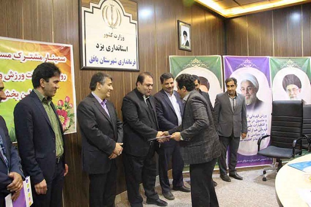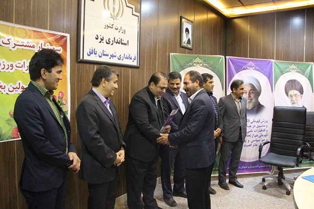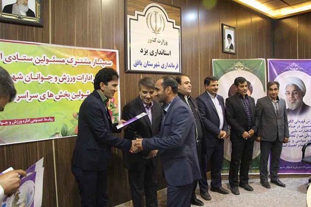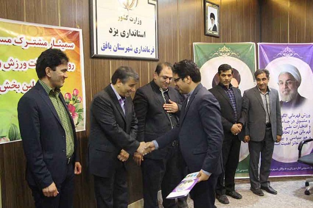 یزد فردا :سمینار روسای ادارات ورزش و جوانان شهرستانها، مسئولان ستادی اداره کل،و مسئولان بخش های سراسر استان یزد با حضور مدیرکل ورزش و جوانان استان یزد در سالن کنفرانس شیخ محمد تقی بافقی فرمانداری بافق برگزارشد.