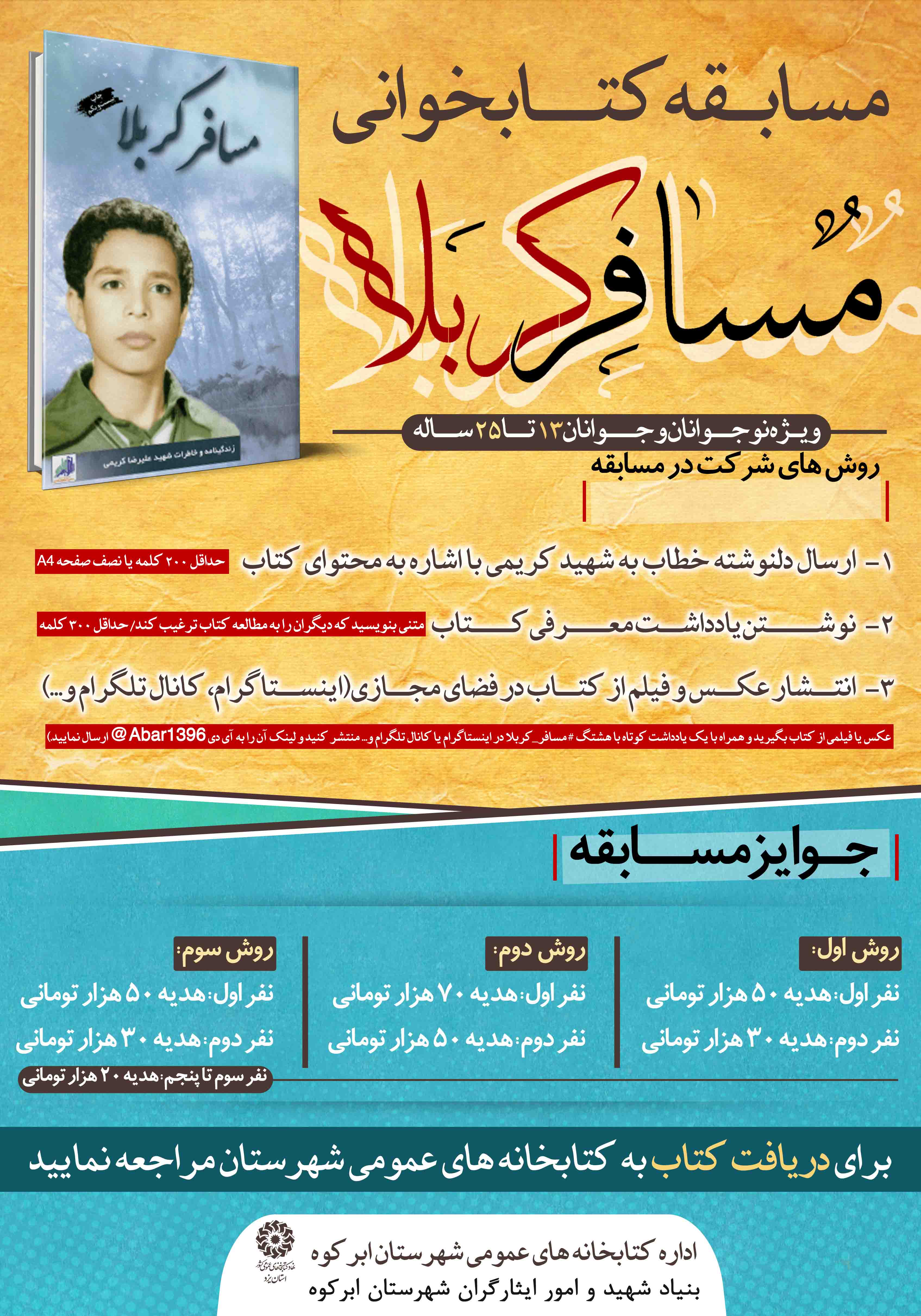 مسابقه کتابخوانی از کتاب «مسافر کربلا»؛ زندگینامه و خاطرات شهید علیرضا کریمی، در کتابخانههای عمومی ابرکوه برگزار میشود.