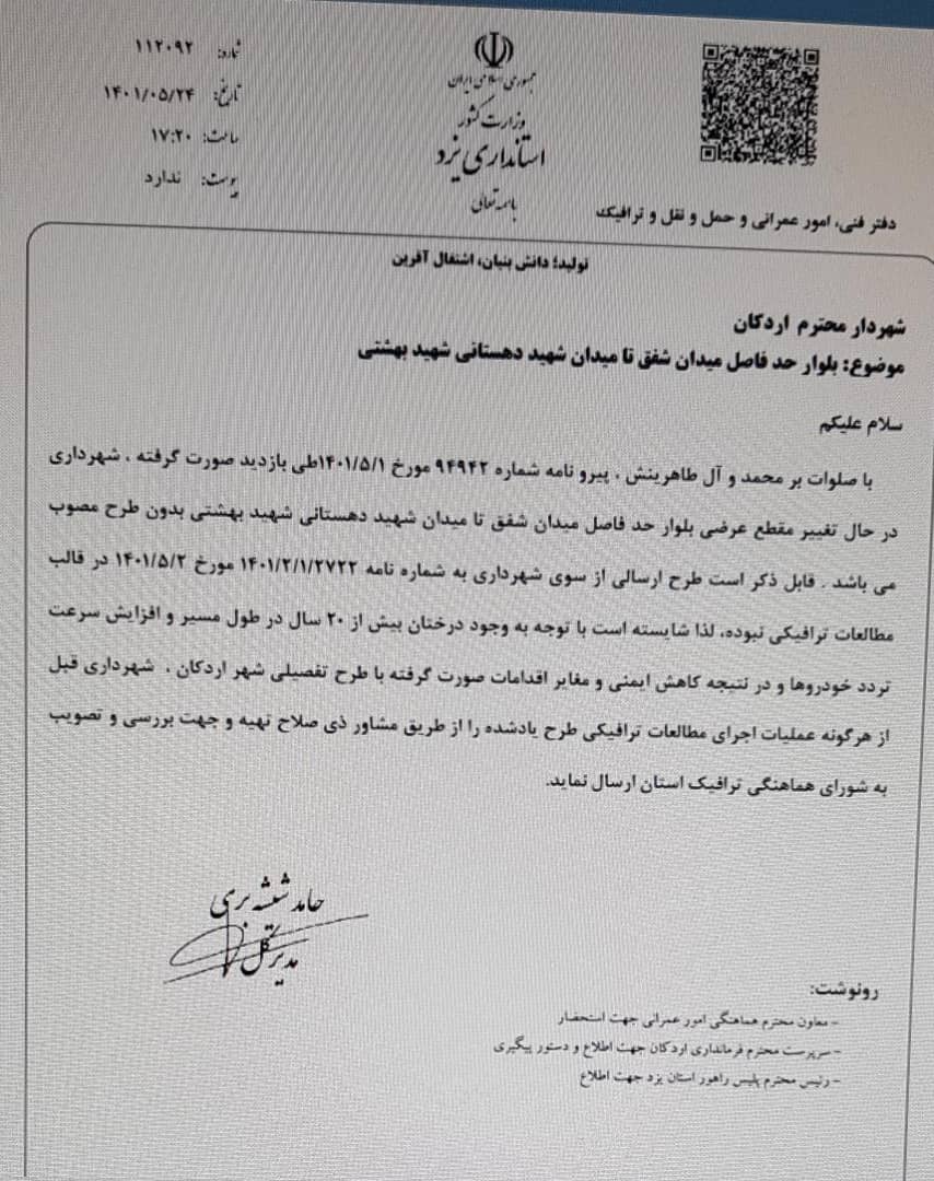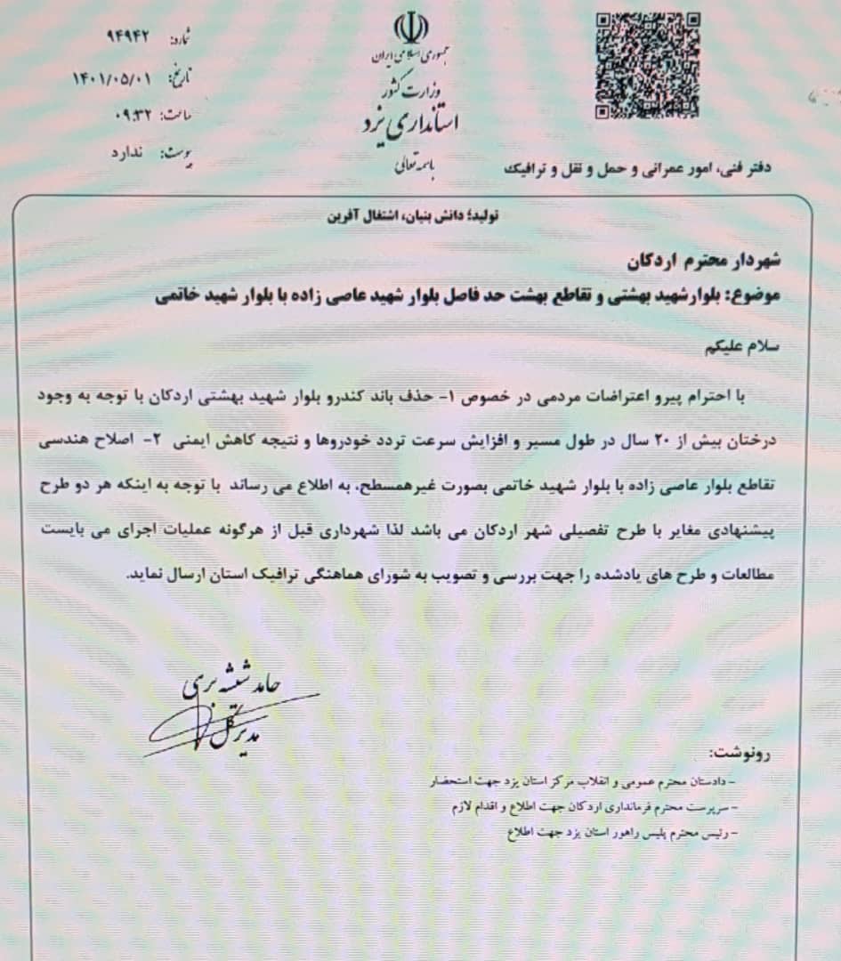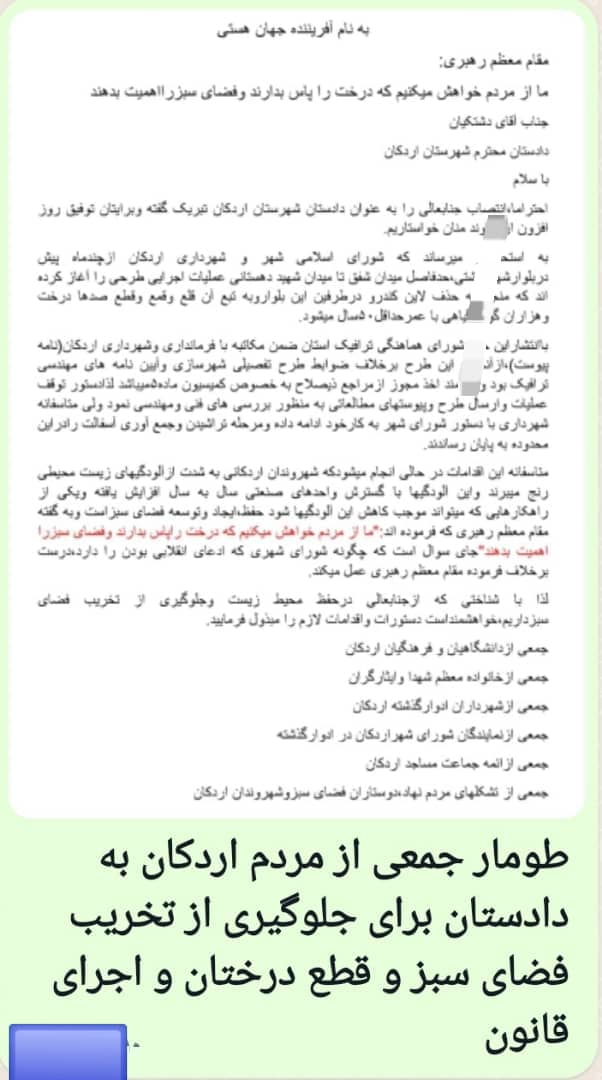 طومار جمعی از مردم اردکان به دادستان برای جلوگیری از تخریب فضای سبز و قطع درختان و اجرای قانون توسط شورای شهر اردکان