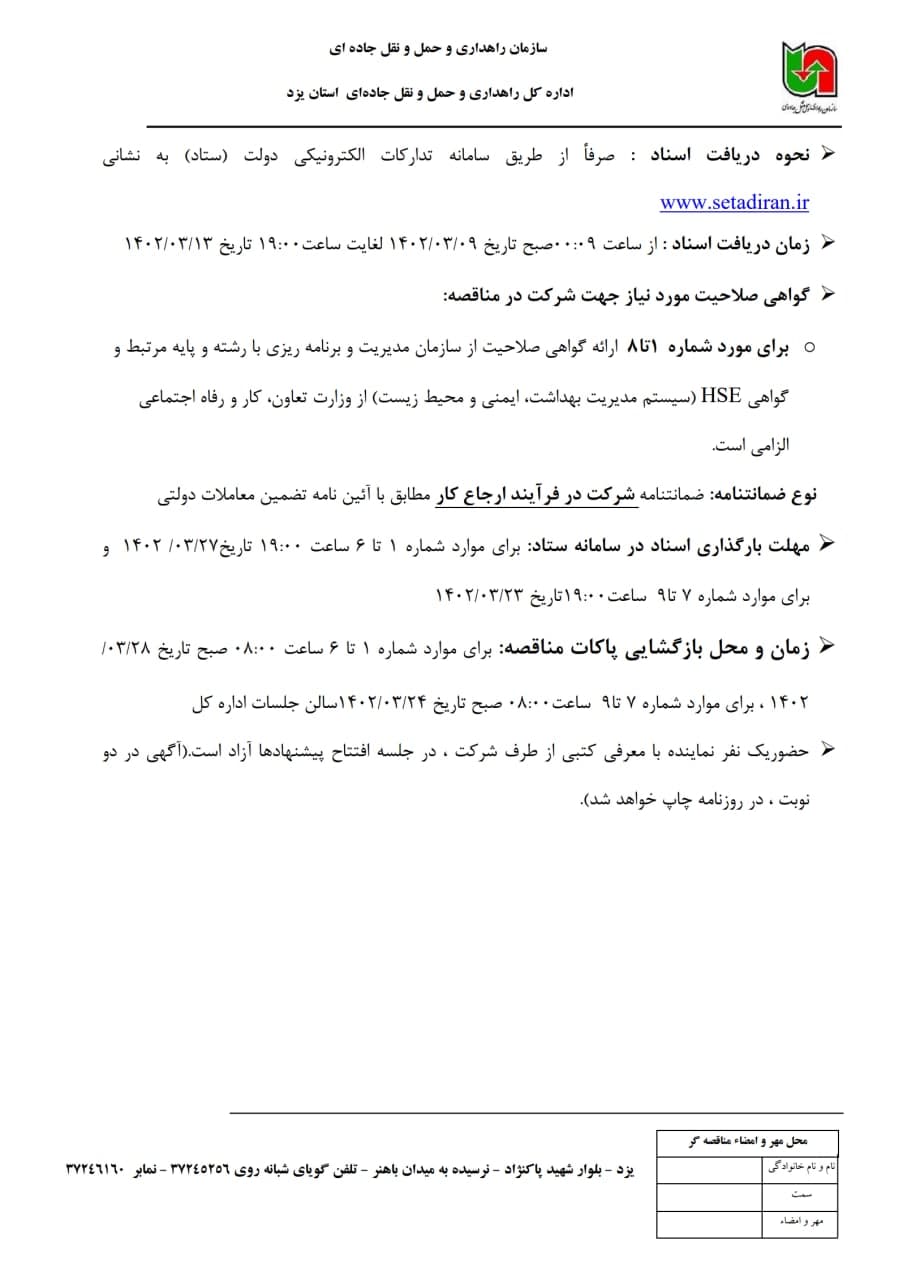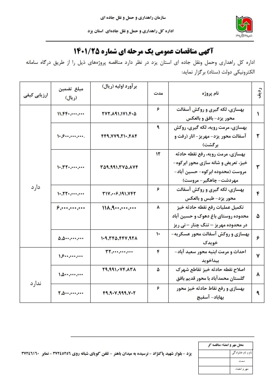 اداره كل راهداري وحمل ونقل جاده اي استان يزد در نظر دارد مناقصه پروژههای ذيل را از طريق درگاه سامانه الکترونیکی دولت (ستاد) برگزار نمايد: