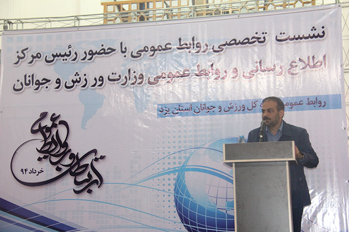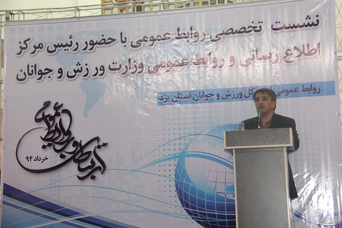 نشست تخصصي روابط عمومي‌‌هاي هيات ورزشي استان يزد با حضور "مازيار ناظمي" رييس مركز اطلاع‎‎رساني و روابط عمومي وزارت ورزش و جوانان ، عباسعلی رضایی معاون توسعه منابع و نیروی انسانی استاندار ، مجید جوادیان زاده مدیرکل امور اجتماعی و فرهنگی استانداری یزد ، مسعود شریعتی مدیرکل ورزش و جوانان استان یزد، روساء، دبيران و مسئولان هيات‎‎ها و باشگاه‎‎هاي ورزشي استان در هتل والی یزد برگزار شد.