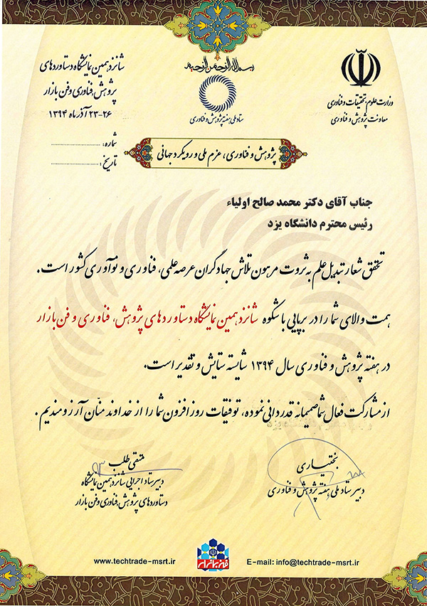 به گزارش دریافتی از معاونت پژوهش و فنآوری، دانشگاه یزد نیز با ارائه تعدادی از دستاوردهای پژوهشی اساتید، به شرح ذیل در این نمایشگاه شرکت کرد: