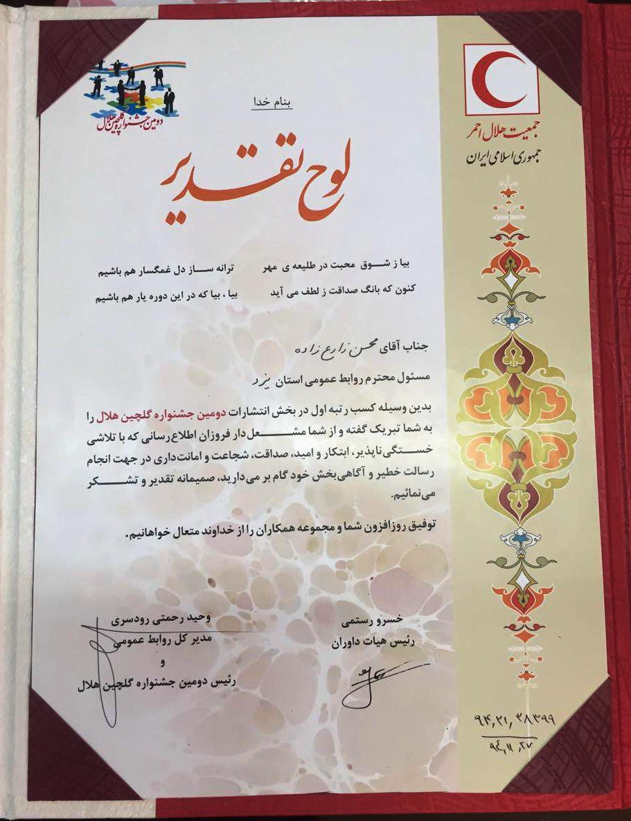 در دومین جشنواره کشوری گلچین هلال که در شیراز برگزار شد، روابط عمومی جمعیت هلال احمر استان یزد در بخش انتشارات مقام اول کشوری را کسب کرد .