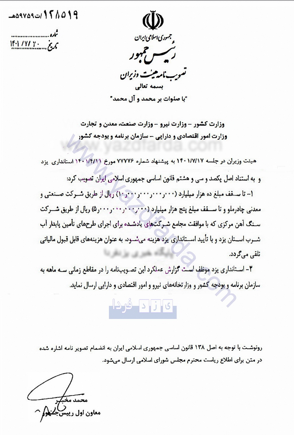 هیئت وزیران در جلسه مورخ ۱۷ مهر ۱۴۰۱، به منظور تأمین مالی طرح های تأمین پایدار آب شرب در استان یزد و جلوگیری از تنش آبی بیشتر در این استان، مصوب کرد تا سقف مبلغ ۱۰ هزار میلیارد ریال از طریق شرکت صنعتی و معدنی چادرملو و تا سقف مبلغ ۵ هزار میلیارد ریال از طریق شرکت سنگ آهن مرکزی که با موافقت مجامع شرکت های یادشده برای اجرای طرح های مذکور با تایید استانداری یزد هزینه می شود، به عنوان هزینه های قابل قبول مالیاتی تلقی گردد.