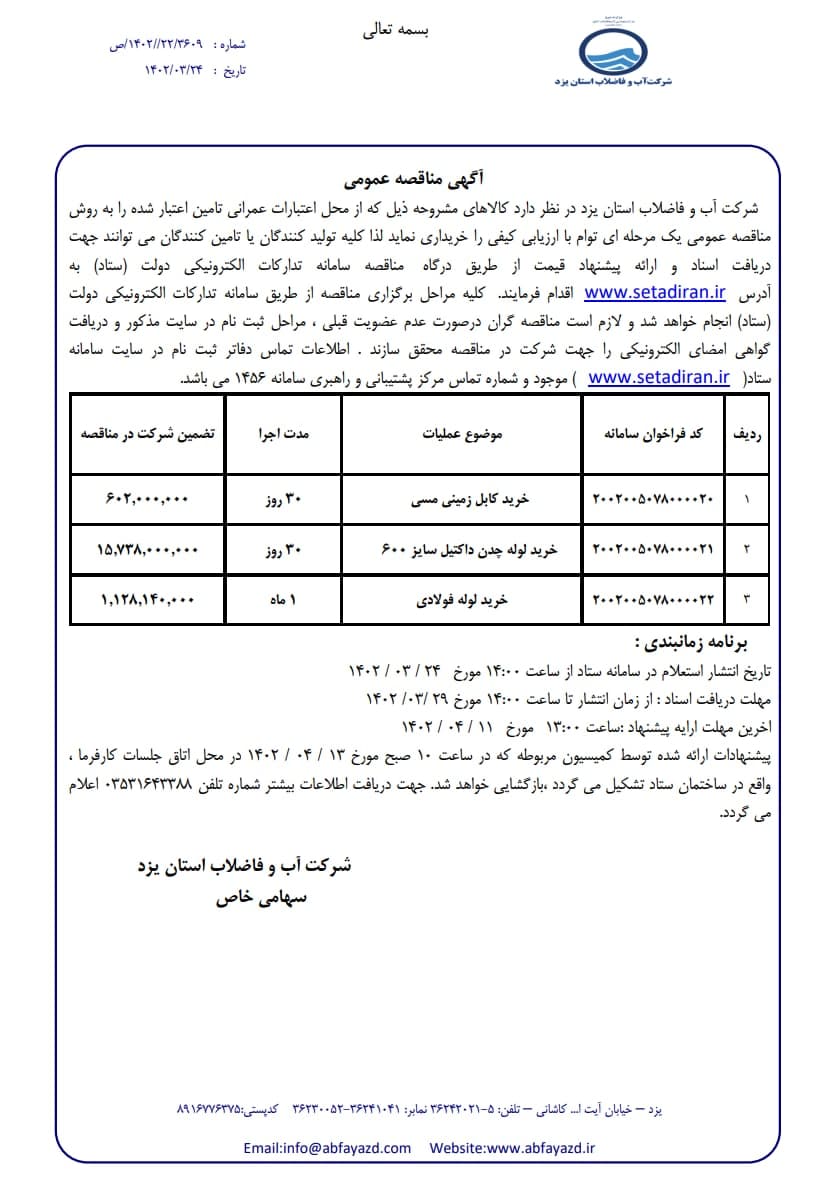آگهي مناقصه عمومي يك مرحله اي توام با ارزيابي كيفي / شرکت آب و فاضلاب استان یزد
