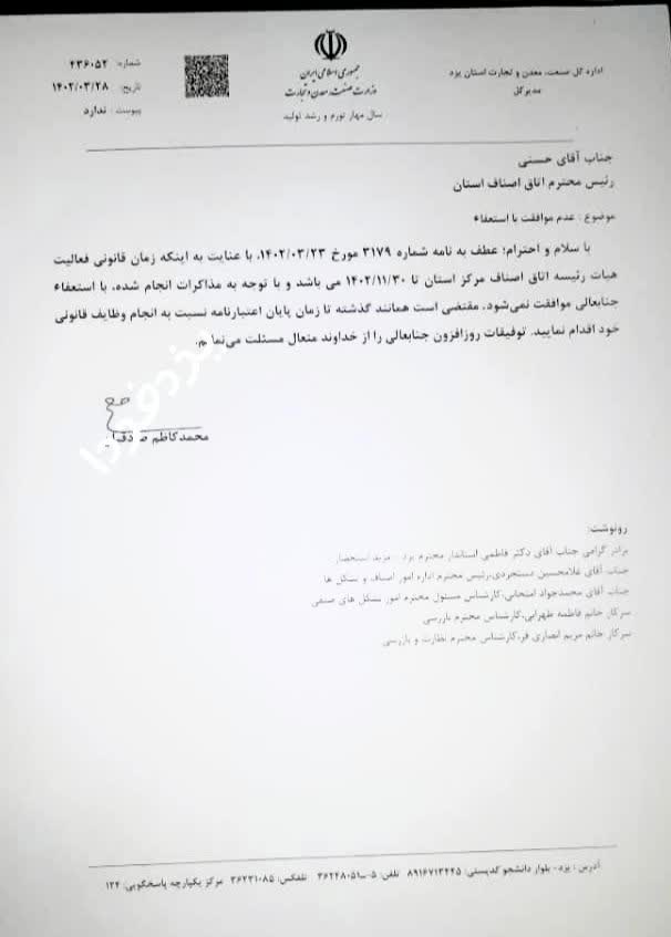 با سلام و احترام ؛عطف به نامه شماره ۳۱۷۹ مورخ ۱۴۰۲/۰۳/۲۳ با عنایت به اینکه زمان قانونی فعالیت هیات رئیسه اتاق اصناف مرکز استان تا ۱۴۰۲/۱۱/۳۰ میباشد و با توجه به مذاکرات انجام شده، با استعفاء جنابعالی موافقت نمیشود .