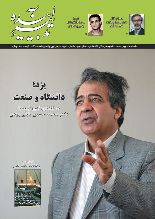 بررسی مشکلات اساسی یزد توسط مهندس وزیری هامانه، پژوهش درخصوص صنعت گردشگری استان و آلودگی هوای شهر یزد، گزارش آماری بارندگی استان در سال آبی 91 و همچنین تحلیل جامع انتخابات مجلس نهم در استان از دیگر مطالب این ماهنامه است.