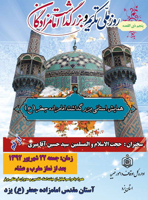 به گزارش روابط عمومی اداره کل اوقاف و امور خیریه استان یزد، حجت الاسلام محمود میرجلیلی در این رابطه افزود: هم زمان با دهه کرامت و پنجم ذی القعده روز ملی تکریم و بزرگداشت امامزادگان و در راستای ترویج و نشر معارف نورانی قرآن کریم و توسعه و تعمیق فرهنگ پیامبر اکرم و اهل بیت (عليهم‎السلام)، گسترش سطح معرفت اقشار مختلف جامعه نسبت به امامزادگان و تبدیل بقاع متبرکه به قطب فرهنگی همایش استانی گرامیداشت امامزاده جعفر(ع) در یزد برگزار می شود.
