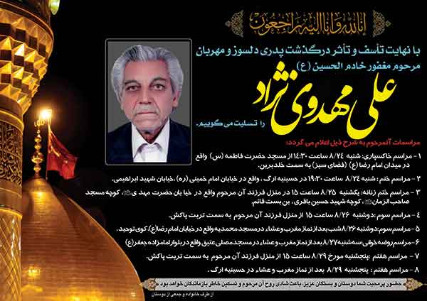 ضمناً به اطلاع دوستان و عزیزان می رسانیم مراسم تشییع پیکر پاک خادم الحسین مرحوم حاج علی مهدوی نژاد فردا(شنبه) ساعت ۱۴:۳۰ از مسجد حضرت فاطمه (س) واقع در میدان امام رضا ع (فضای سبز) به سمت خلدبرین ومجلس ختمی به یاد آن مرحوم شنبه شب ساعت ۱۹:۳۰ در مسجد و حسینیه ارگ واقع در خیابان امام خمینی(ره)- خیابان شهید ابراهیمی(ره) برگزار خواهد شد.