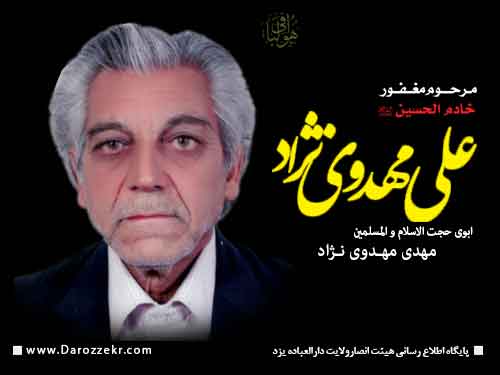 عرض تسلیت و نثار حمد برای شادی روح آن بزرگوار، وظیفه ای است کوچک و ادای دینی ناچیز از خادمین هیئت انصار ولایت یزد. ان شاءالله که روح آن بزرگوار در جوار حق قرین رحمت الهی و همنشین سرور و سالار شهیدان، حضرت اباعبداللّه الحسین(ع) باشد.