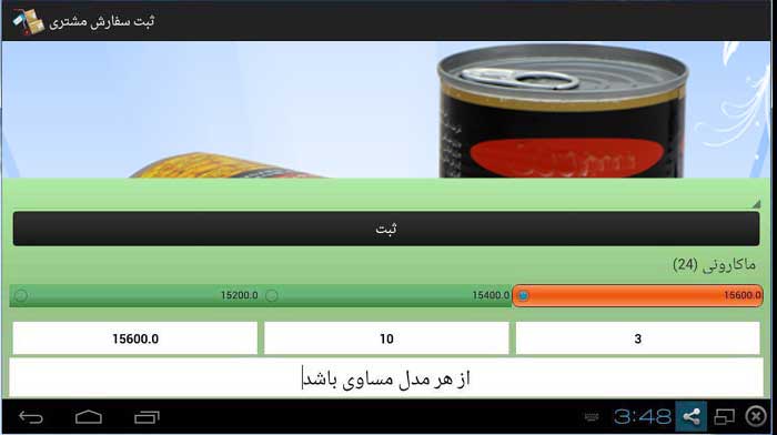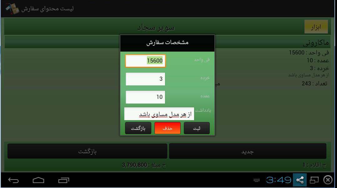 ذخيره آسان : پس از نوشتن تعداد و تعيين قيمت به محصول بعدي يا قبلي جارو كنيد. همزمان سفارش هم ثبت شده است