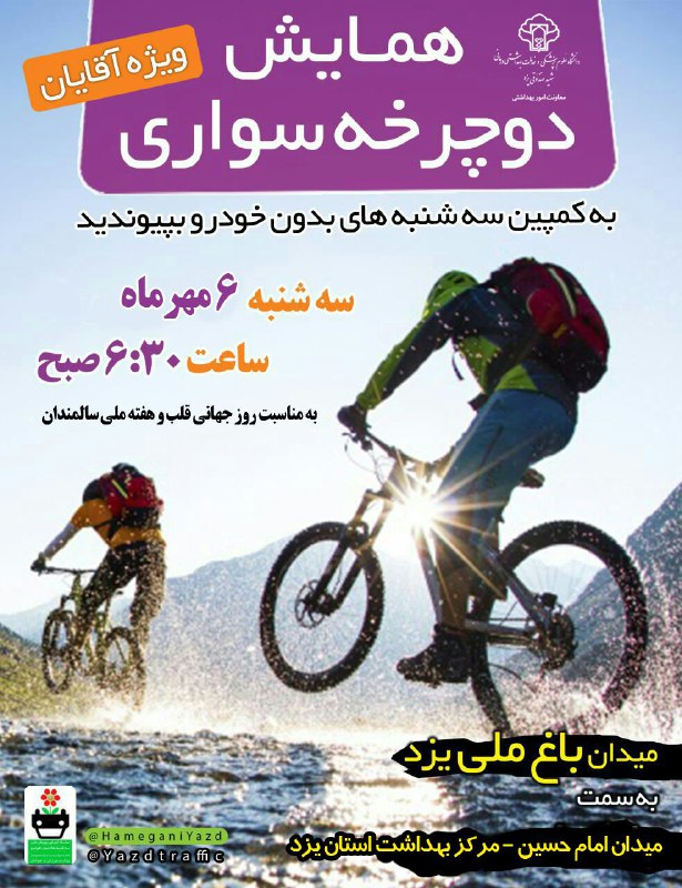 در صبحگاه سه شنبه ششم مهرماه همایش دوچرخه سواری سه شنبه های بدون خودرو با شعار مهربانی با قلب، نیروبخش زندگی در یزد به میزبانی مرکز بهداشت استان یزد برگزار گردید.