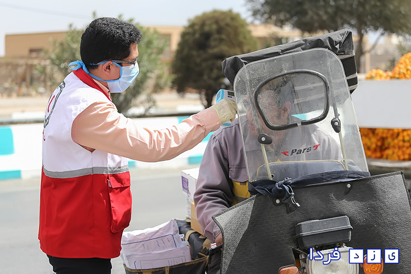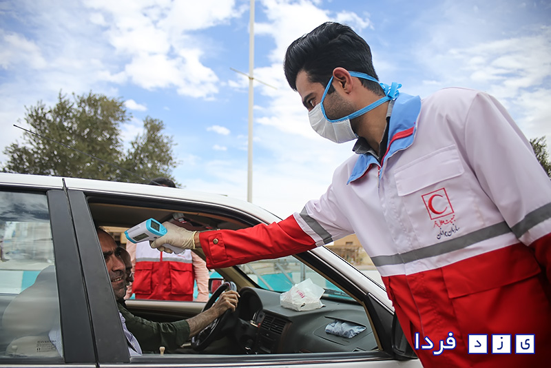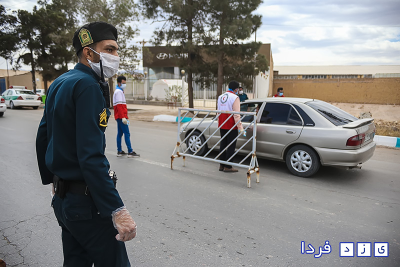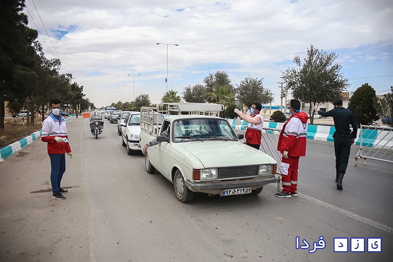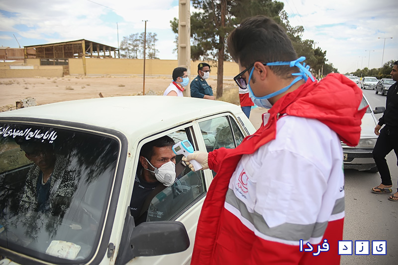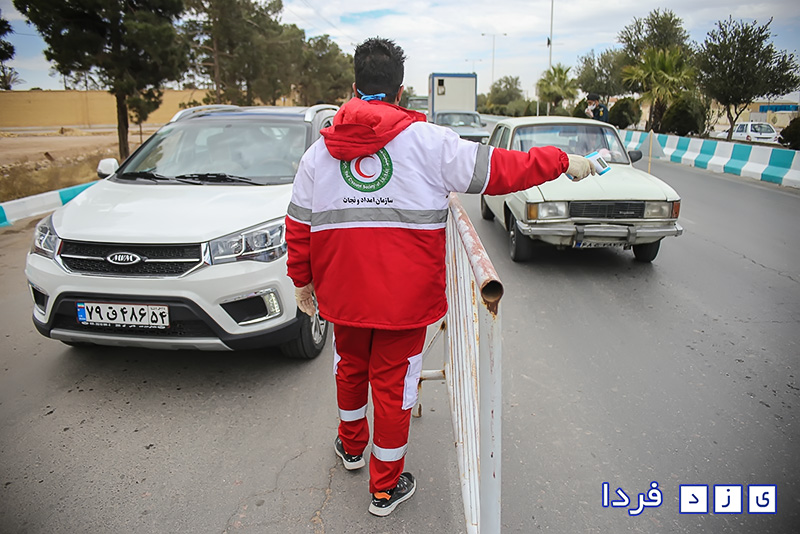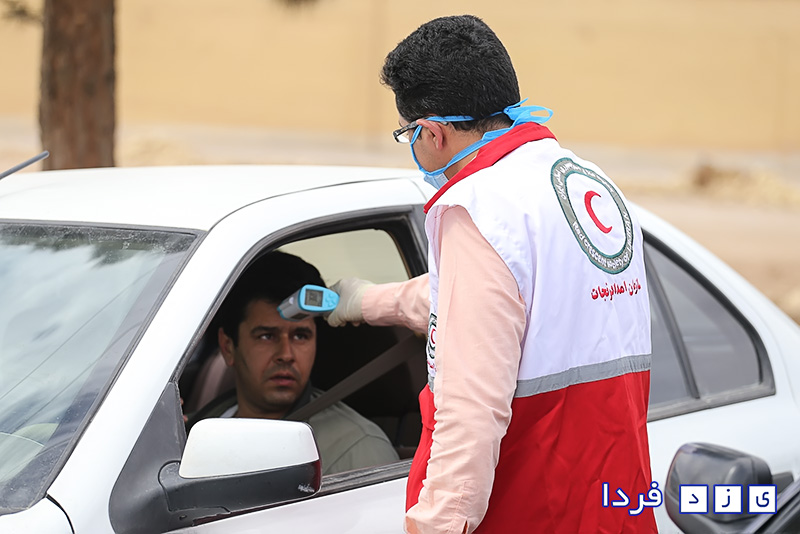 ایستگاه غربالگری تب سنجی هلال احمر با همکاری نیروهای بسیج و انتظامی به منظور جلوگیری از شیوع ویروس کرونا در دروازه قرآن یزد
