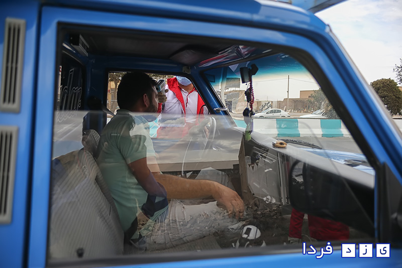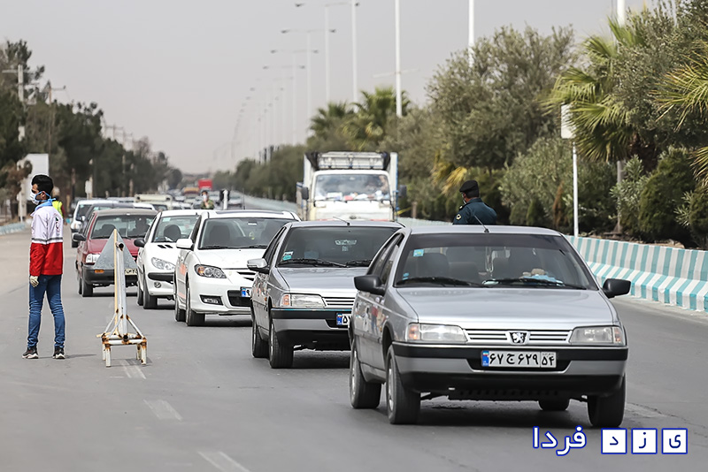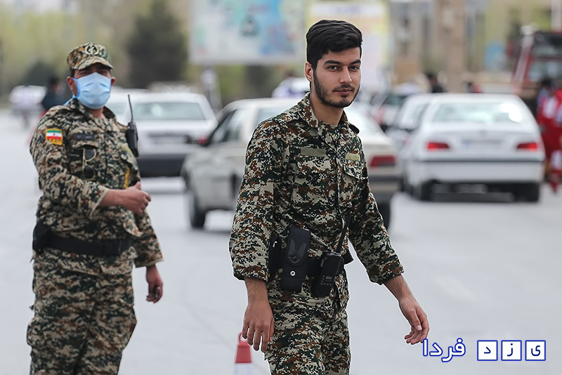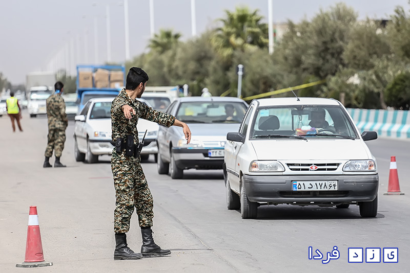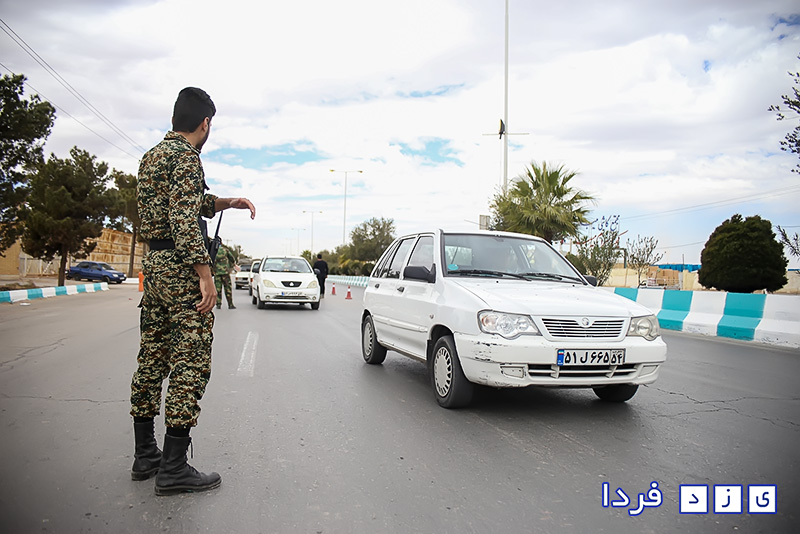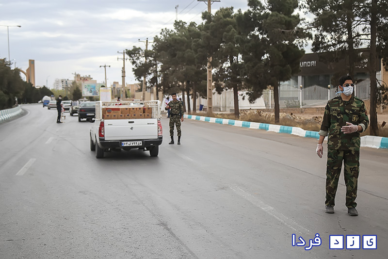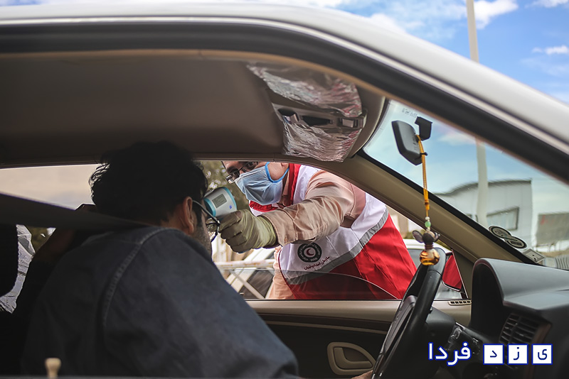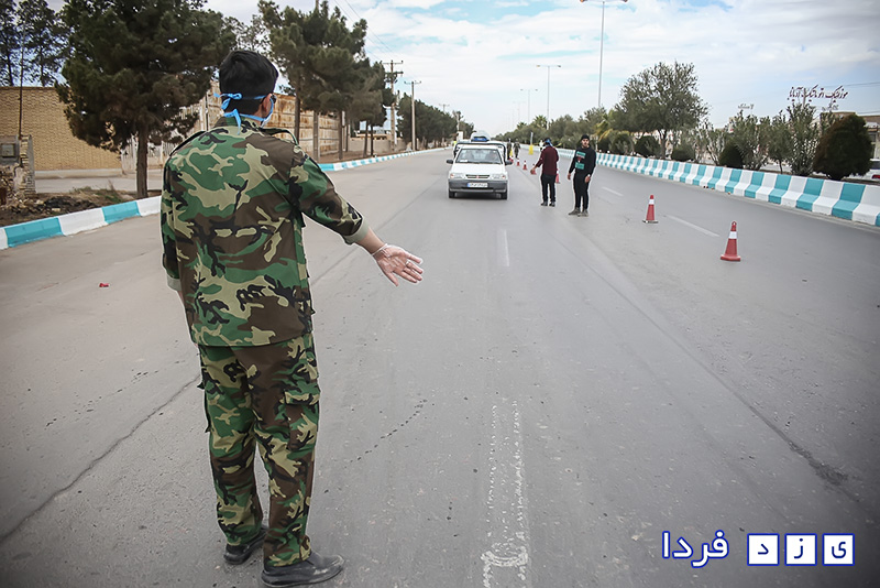 ایستگاه غربالگری تب سنجی هلال احمر با همکاری نیروهای بسیج و انتظامی به منظور جلوگیری از شیوع ویروس کرونا در دروازه قرآن یزد