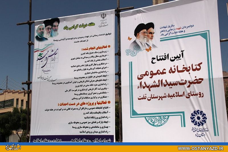 رئیس کتابخانه های عمومی شهرستان تفت نیز با گرامیداشت هفته دولت، گزارشی از روند ساخت و راه اندازی کتابخانه حضرت سید الشهداء اسلامیه ارائه کرد.یادآور می شود کتابخانه سیدالشهداء اسلامیه با اعتباری بالغ بر 7 هزار میليون ریال از بودجه خیری احداث شده است.