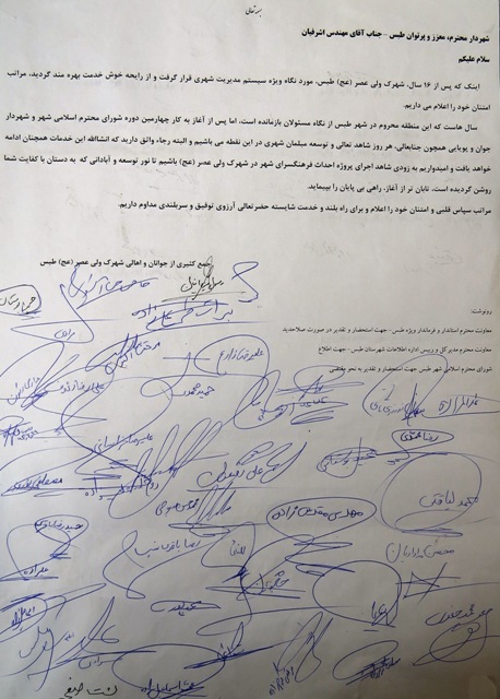 متن نامه اهالي شهرك حضرت ولي عصر(عج) طبس كه رونوشتي از آن براي معاون استاندار و فرماندار ويژه، معاون مديركل و رييس اداره اطلاعات شهرستان و شوراي اسلامي شهر طبس ارسال شده است به اين شرح است: